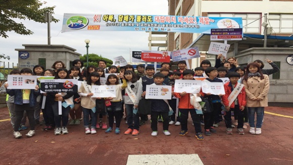 학생들이 등교하는 시간에 맞춰 전교학생 회장단과 5,6학년 학급임원들은 금연 피켓과 어깨띠를 착용하고 교문 앞에서 구호를 외치며 흡연예방 및 금연운동에 동참할 것을 당부했다.