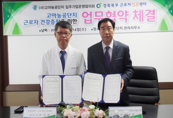 경북북부 근로자건강센터(센터장 유재영)와 (사)고아농공단지 입주기업운영협의회(회장 김병환)는 ‘고아농공단지 근로자 건강증진’ 이라는 공동의 목표를 설정하고 추진해 나가기 위해 14일 업무협약을 체결했다.
