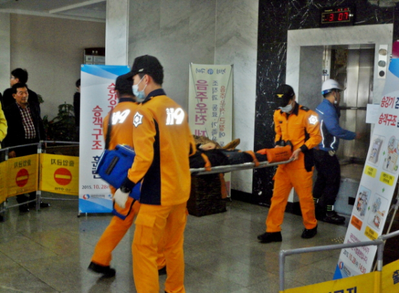 구미시(시장 남유진)는 10월 28일 청사 본관 현관에서 승강기유지관리업체 및 관내 대단지 아파트 관리소장 등 100여 명이 참석한 가운데 승강기 갇힘사고 발생에 대비한 긴급구조 훈련을 실시했다.