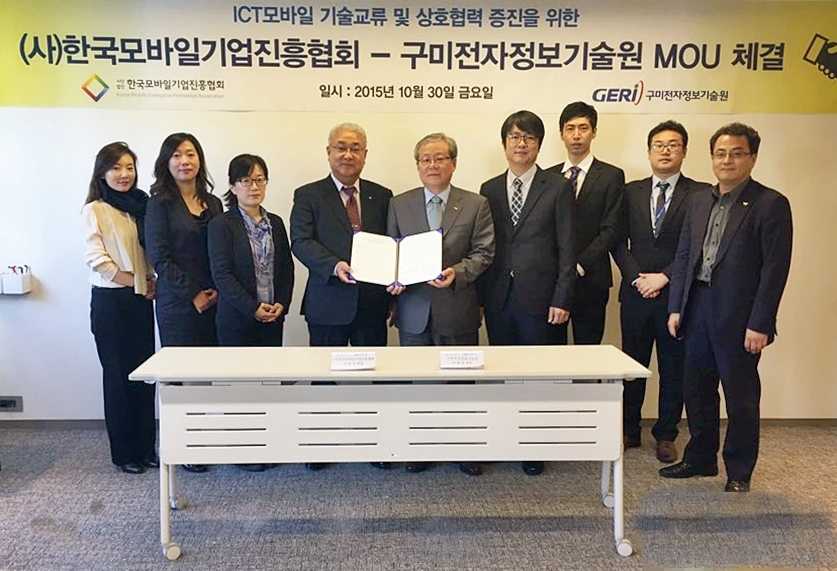 구미전자정보기술원(원장 차종범, 이하 GERI)과 한국모바일기업진흥협회(협회장 김동민, 이하 KMEPA)는 10월 30일 KMEPA에서 ICT모바일 중소기업 기술 및 교육지원 활성화를 위한 협력관계를 구축하고 상호간 발전증진에 공헌할 목적으로 업무협약을 체결했다.