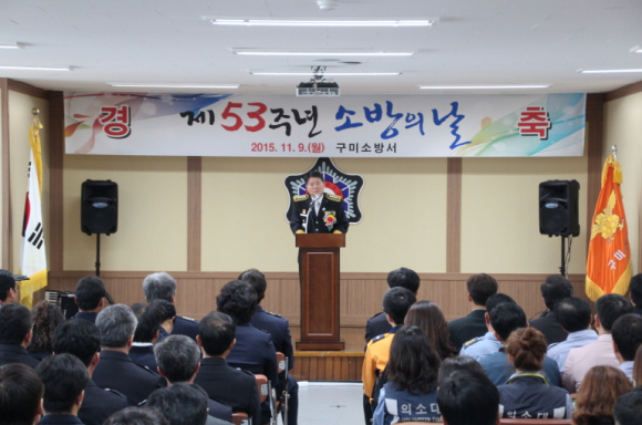 구미소방서(서장 이태형)는 11월 9일 2층 대회의실에서 윤창욱 경상북도의회 부의장, 장영석 도의회 건설소방위원을 비롯한 소방공무원 남·녀 의용소방대원 등 290여명이 참석한 가운데 ‘제53주년 소방의 날 기념식’행사를 가졌다.