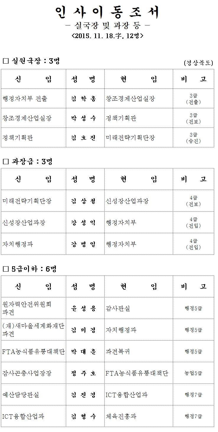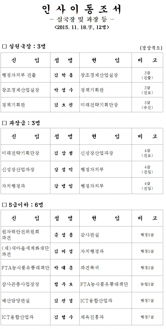 경북도(도지사 김관용)는 11월 17일자로 인사이동을 단행했다. |