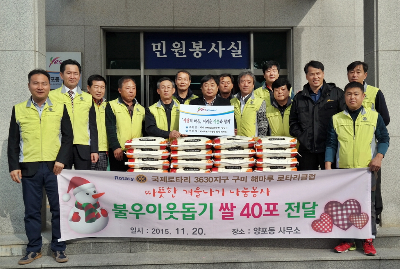 국제로타리3630지구 해마루로타리클럽(회장 엄창호)은 11월 20일 관내 어려운 이웃에게 백미 800kg(20kg/40포대, 시가 200만원 상당)을 전달하며 추운 겨울 월동준비에 어려움을 겪고 있는 이웃들에게 따뜻한 마음을 전했다. 해마루로타리클럽은 회원 32명으로 구성된 봉사단체로 매년 관내 자연정화활동, 사회봉사활동, 이웃돕기 등 어두운 사회를 밝히는 등불역할을 해오는 봉사단체이다.