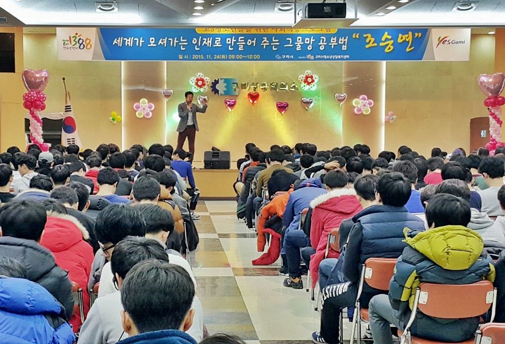 구미시(시장 남유진)는 지역 고등학교 3학년 청소년 600여 명이 참석한 가운데 24일 화요일 구미상공회의소 대강당에서 고3 청소년을 위한 진로특강을 실시했다. 이날 행사는 수능 이후 지역 고3 청소년들이 그 동안 받은 학업 스트레스를 날려버리고 자신의 미래에 대해 깊이 고민하는 계기를 제공하기 위해 사회 저명인사의 특강 형식으로 진행되었다.