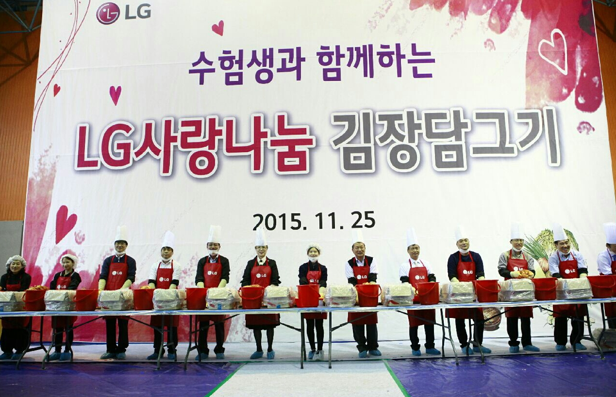 행사에는 LG자원봉사자 200여명과 구미여성단체협의회, 기업사랑줌마클럽 50여명, 수험생 60여명이 참여한 가운데 김장김치 9,000포기를 현장에서 사랑의 양념으로 버무려 지역복지시설 50여곳, 결연가정 200여세대에 따뜻한 겨울을 보낼 수 있도록 전달했다.