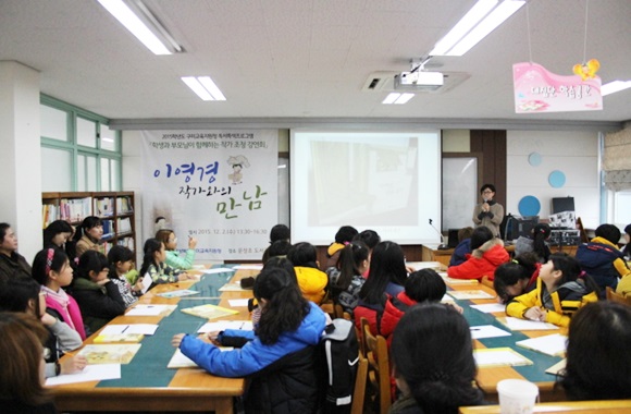 구미교육지원청(교육장 김정숙)은 독서교육특색 프로그램의 일환으로 12월 2일 ‘학생과 학부모가 함께하는 작가초청강연회’를 개최했다. 이 날 작가초청강연회는 문학에 관심과 소질이 있는 구미관내 초등학생 61명과 부모님을 대상으로 이영경 작가와 대화 및 체험활동을 하는 시간을 가졌다.