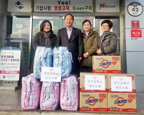 선주중학교 학부모회(회장 최정하)는 12월 7일 선주원남동(동장 우석도) 주민센터를 방문해 생활이 어려운 저소득을 위해 써달라며 이불과 라면을 기탁했다.