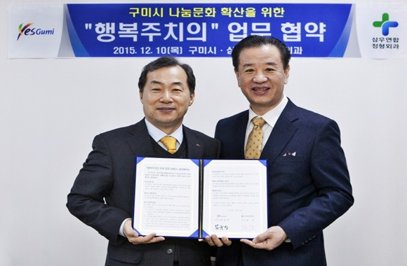 구미시(시장 남유진)는 12월 10일 부시장실에서 소외계층 의료복지 증진 및 구미시 나눔문화 확산을 위해 삼우연합정형외과의원(원장 김식, 형곡동 소재)과 ‘행복주치의 업무 협약식’을 가졌다.