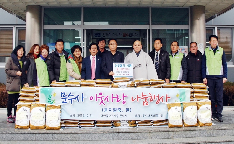 또, 이날 쌀 전달식에 이어 문수사, 신도회(회장 이실용)와 자원봉사단원은 밤새 준비한 팥죽 도시락 1천개를 관내 기관 및 경로당, 사랑의 쉼터, 소재지 상가에 직접 배부하는 등 이웃사랑, 지역사랑의 선도자 역할을 톡톡히 했다.