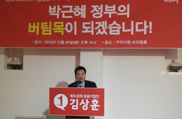 김상훈 제 20대 구미을 총선 예비후보가 12월 29일 구미시청 열린나래에서 출마 기자회견을 가졌다. 김 예비후보는 “내 일처럼 뛰어서 만든 박근혜 정부가 정쟁의 소용돌이 속에 있는 현실이 개탄스럽다”며, “더 이상의 방관은 올바른 정치를 열망하는 구미 시민에게 씻을 수 없는 죄를 짓는 것”이라며, 출마의 변을 밝혔다.