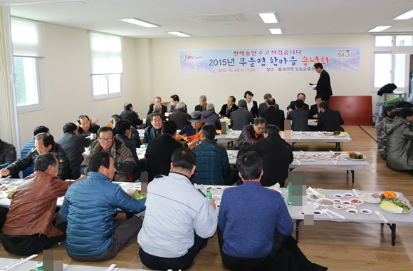 무을면(면장 손정애)은 12월 29일 춤새마을 도농교류센터에서 김태환 국회의원, 임춘구·양진오 시의원, 각 기관단체장, LG전자 노동조합구미지부 서성묵 지부장을 비롯한 성품성금 기탁자, 이장, 새마을지도자 등 150여 명이 참석한 가운데 ‘2015년 무을면 한마음 송년회’ 행사를 성황리에 개최했다.