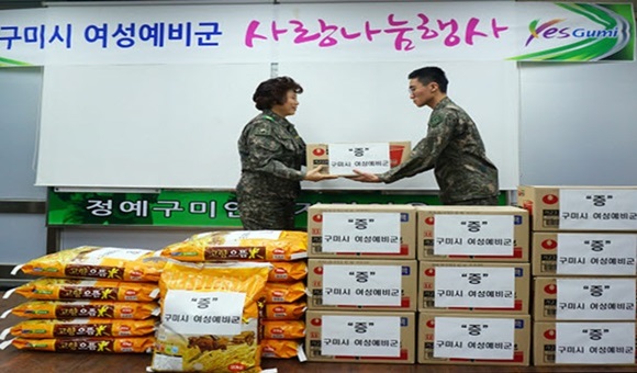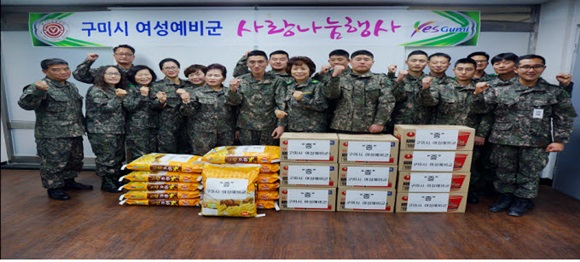 구미시 여성예비군은 평소 지역안보지킴이로서 각종 군 관련 행사 및 봉사활동을 통해 민·군 유대 강화에 가교 역할을 충실히 하고 있으며, 매년 연말연시를 맞이해 사랑나눔 행사를 가져 주위에 귀감을 사고 있다.