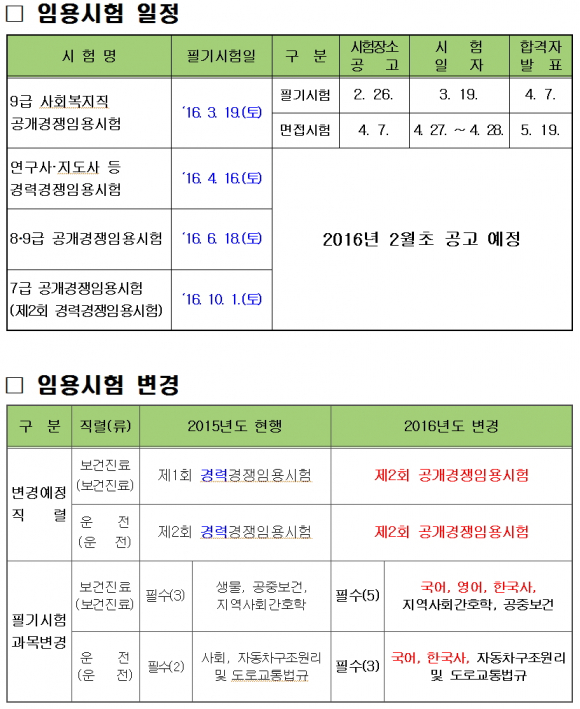 그리고, 임용시험에 있어서 작년도와 달라진 것은 보건진료 및 운전직시험이 경채시험에서 공채시험으로 변경되고 시험과목도 변경된다.
