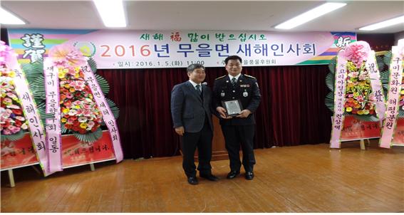 장경수 무을파출소장이 무을면의 발전과 화합에 헌신노력한 공을 인정맏아 ‘2016년 무을면 새해인사회’에서 공무원부문 ‘무을면민상’을 수상했다.