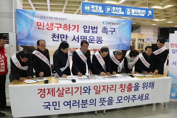 1월 21일 구미역사 내 2층 광장에서는 구미상공회의소 류한규 회장을 비롯한 회장단, 남유진 시장, 김태환 국회의원, 윤창욱 경상북도의회 부의장, 도·시의원, 상의 임직원 및 관계자가 참석한 가운데 ‘민생구하기 입법 촉구 천만 서명운동’을 실시했다.