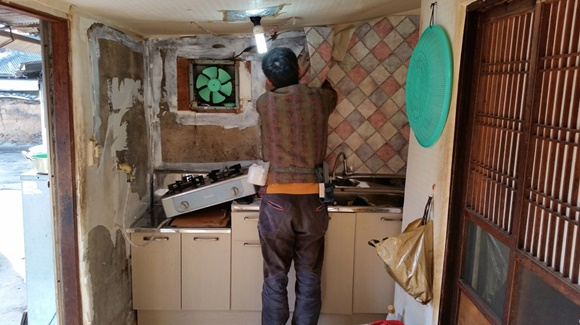 회원들은 추운날씨에도 불구하고 부엌을 도배를 하고 수납장을 설치해 어르신이 편하게 쓰실수 있도록 개조 하고, 전기장판도 전달해 추위에도 대비할 수 있도록 했다.
