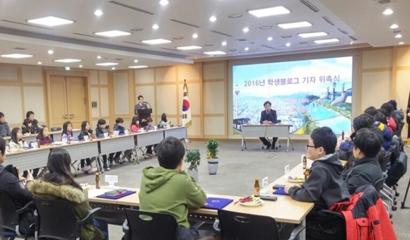 구미시(시장 남유진)는 1월 25일 시청 상황실에서 미래의 주역인 학생들이 블로그를 통해 생생한 구미이야기를 네티즌에게 알리게 될 ‘2016년 학생블로그 기자단’ 위촉식을 개최했다.