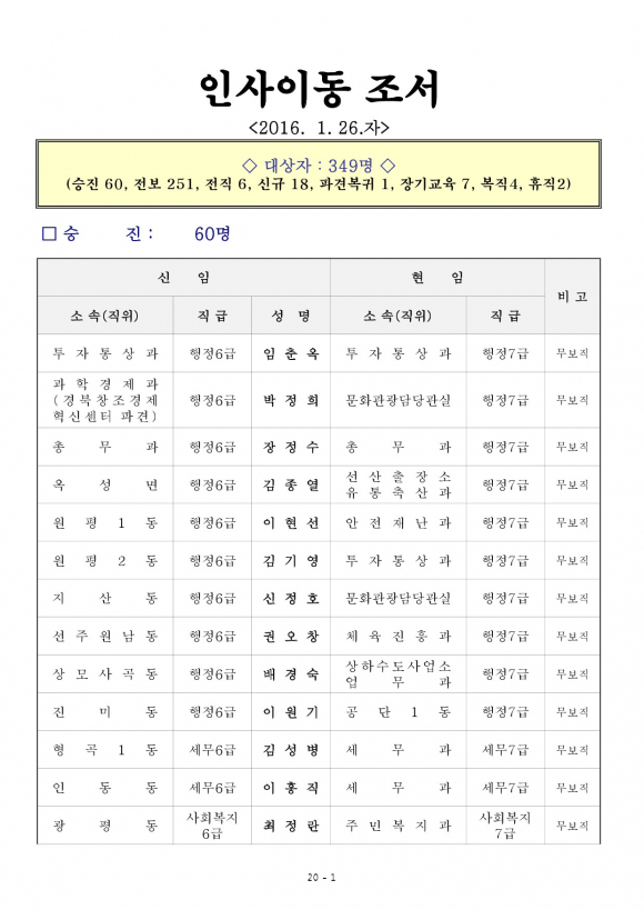349명(승진 60, 전직6, 파견복귀1, 전보251, 신규18, 장기교육7, 복직4, 휴직2)