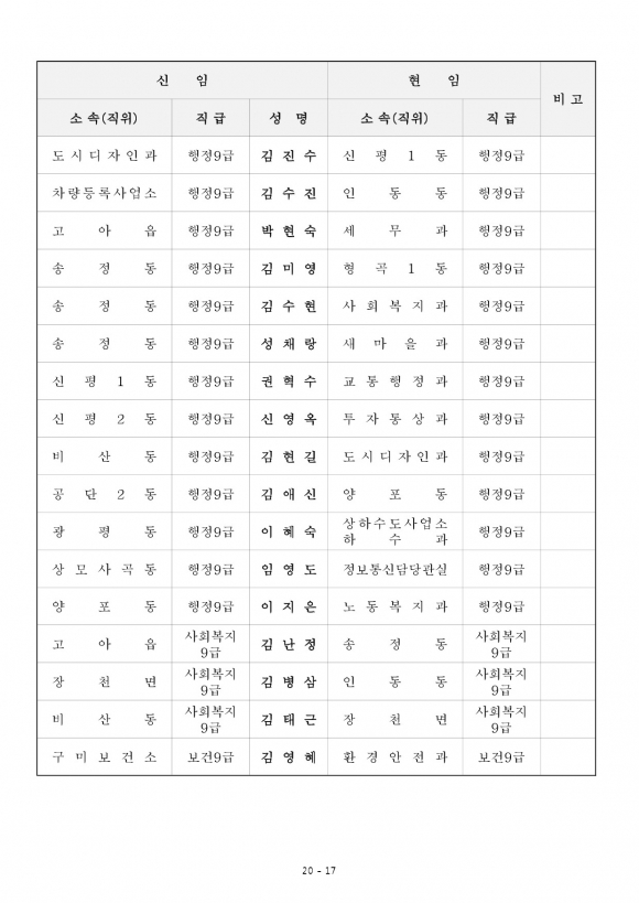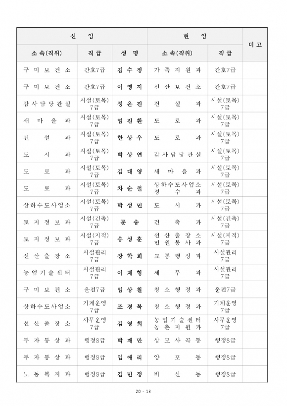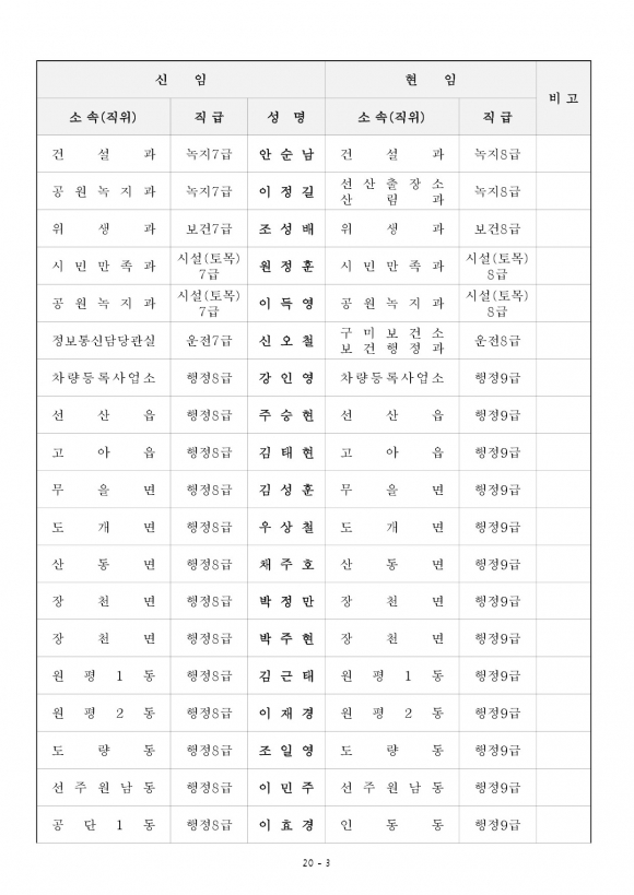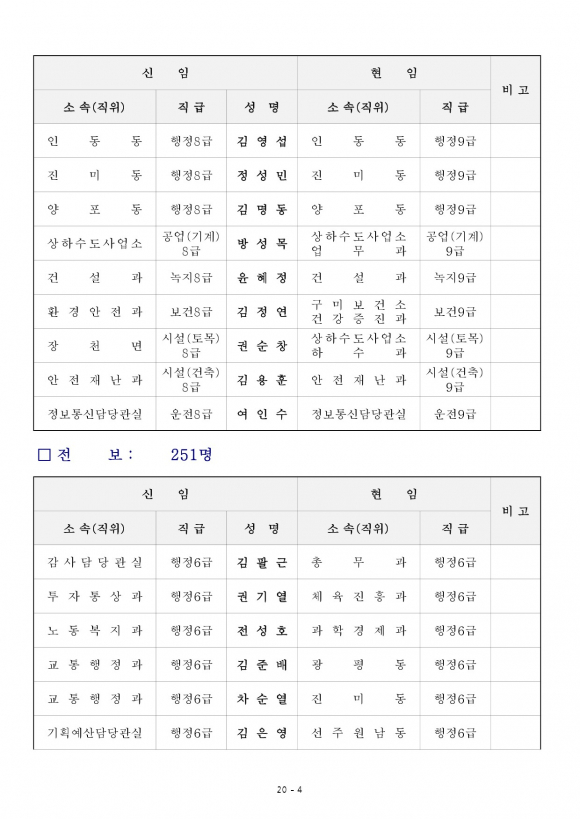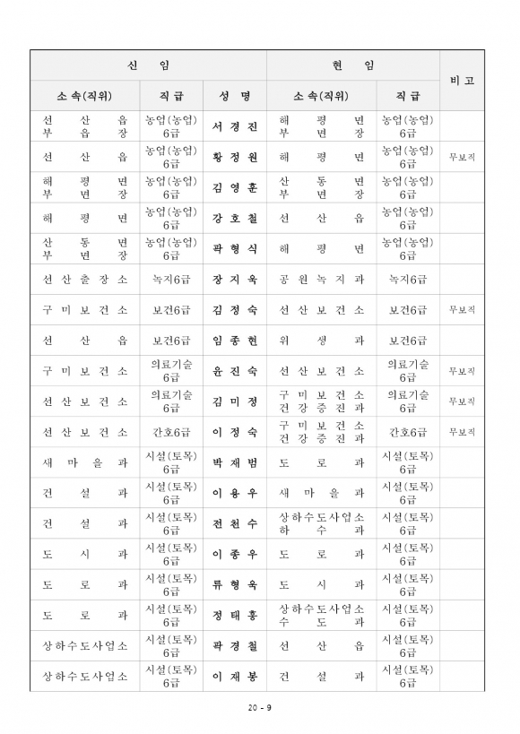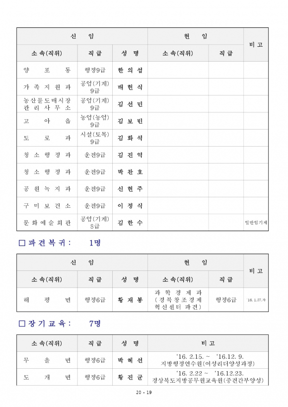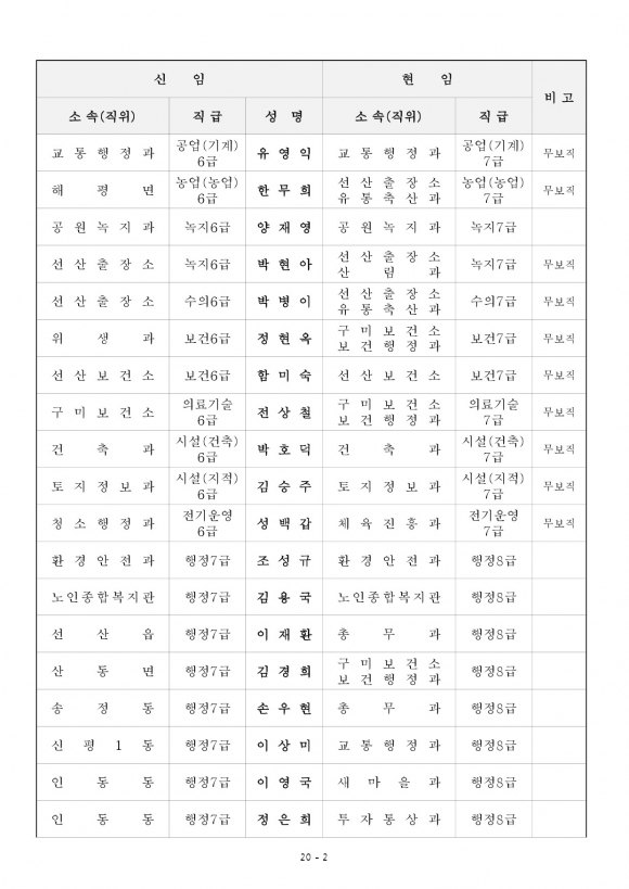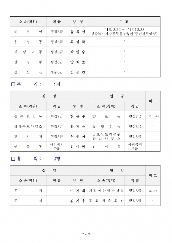 구미시(시장 남유진)는 1월 26일자 349명(승진 60, 전직6, 파견복귀1, 전보251, 신규18, 장기교육7, 복직4, 휴직2)인사이동 조서를 발표했다.