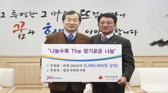 구미시에서는 이웃돕기성금을 경북사회복지공동모금회로 전액 기탁하고, 성품은 기탁자의 뜻에 따라 읍·면·동 저소득 가구에 골고루 배분했다.