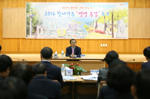 남유진 구미시장은 2016년 새해를 맞아 1월 28일 고아읍을 시작으로 6개 권역별로 방문해 일선 직원들을 격려하고 현장의 생생한 이야기를 듣는 ‘2016 찾아가는 생생공감 토크’를 가진다.