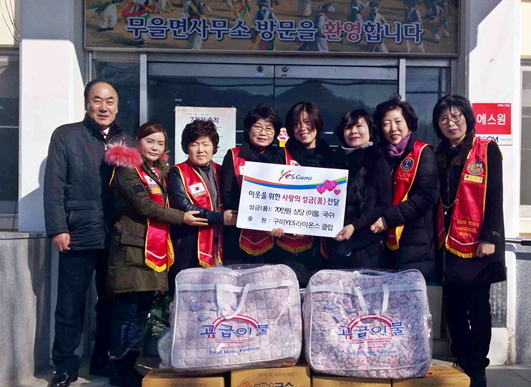 구미YES라이온스클럽(회장 김서정)는 2월 3일 무을면사무소(면장 손정애)를 방문해 설 명절을 앞두고 어려운 이웃을 위해 70만원 상당의 이불과 국수를 전달했다.