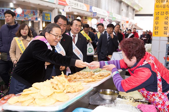 장보기 행사에 참석한 기관장 및 단체 회원들은 온누리 상품권을 이용해 설 제수용품 등을 구입하면서 전통시장 이용 활성화 캠페인을 전개했다.
