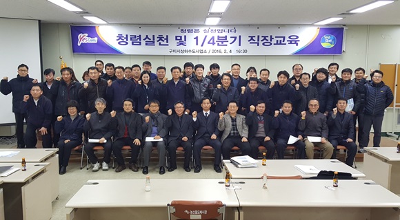 구미시 상하수도사업소(소장 김휴진)는 2월 4일 농산물 도매시장 2층 회의실에서 상하수도사업소 전 직원 60명을 대상으로 청렴실천 및 공직기강 확립, 설 연휴에 대비한 비상근무요령 및 당면현안사항과 업무전반에 대한 직장교육을 실시했다.