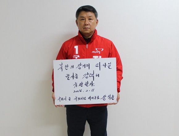 새누리당 장석춘 구미을 총선 예비후보가 설 명절을 하루 앞둔 2월 7일 북한의 장거리 미사일 발사에 대해 11일 선거사무소에서 ‘북한의 장거리 미사일 발사를 강력히 규탄 한다’는 피켓을 들고 명백한 유엔 안보리 결의 위반이라며, 북한 당국의 책임을 추궁했다. |