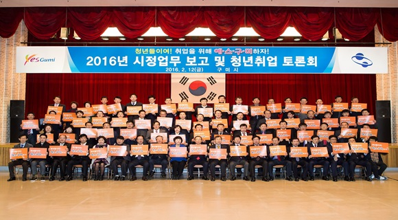 구미시(시장 남유진)는 2월 12일 오전 시청 대회의실에서 5급 이상 간부 등 100여명이 참석한 가운데 ‘2016년 시정업무 보고 및 청년취업 토론회’를 개최했다.