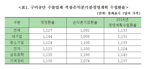 구미상공회의소(회장 류한규)는 2015년 12월 22일 ~ 2016년 1월 8일까지 지역 내 50개 수출업체를 대상으로 ‘구미지역 수출업체 적정, 손익분기점, 2016년 경영계획 수립환율’을 조사했다고 밝혔다.