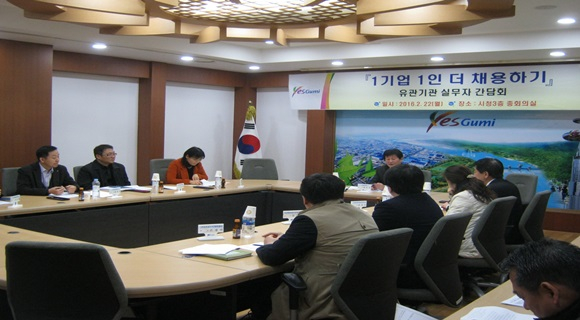 구미시(시장 남유진)는 2월 22일 시청 3층 중 회의실에서 청년 고용절벽 해소를 위해 일자리관련 유관기관 실무자 9명이 참석한 가운데 ‘1기업 1인 더 채용하기’ 간담회를 개최했다.