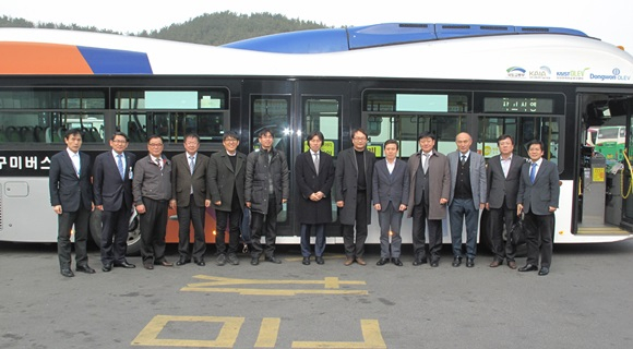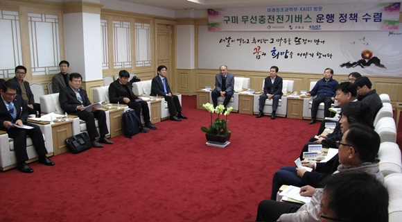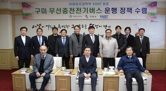 구미시(시장 남유진)는 세계 최초로 대중교통으로 상용 운행 중인 무선충전전기버스의 활성화 방안을 모색하기 위해 2월 23일 미래창조과학부 전성배 전파정책국장 및 KAIST 조동호 무선전력전송연구센터장 등의 일행이 구미시 전기버스 운행현장을 방문했다.