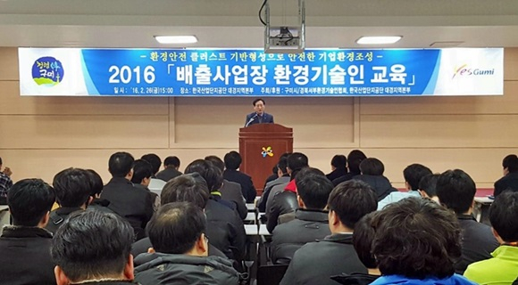 구미시(시장 남유진)는 2월 26일 한국산업단지 대경지역본부 대강당에서 (주)삼성전자 등 배출사업장 환경기술인을 대상으로 ‘2016년 배출사업장 환경기술인 역량강화 교육’을 실시했다.