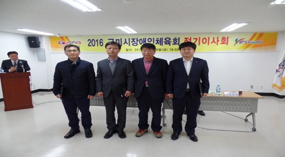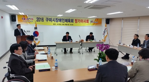 구미시장애인체육회(회장 남유진)는 2월 26일 체육회관 2층 회의실에서 20여명의 임원이 참여한 가운데 ‘2016년 구미시장애인체육회 정기 이사회’를 개최했다.