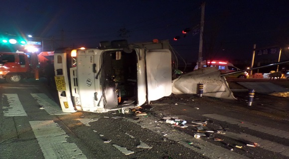 구미시 지산 사거리 돼지수송차량 전도