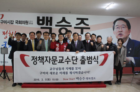 새누리당 구미갑 지역 경선후보로 결정된 백승주 예비후보는 3월 5일 선거사무소에서 금오공대, 구미대, 경운대 등 지역대학을 총망라된 16명의 교수가 참여한 가운데 ‘정책자문교수단 출범식’을 가졌다.