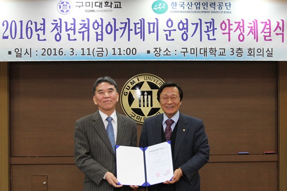 구미대학교(총장 정창주)는 3월 11일 한국산업인력공단 경북지사(지사장 고창용)와 ‘2016년 청년취업아카데미 운영기관 약정’을 체결했다.