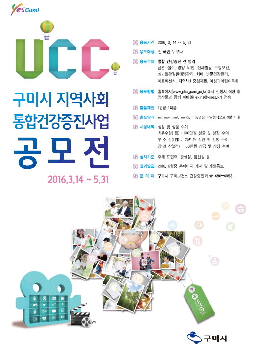 구미시(시장 남유진)는 전 국민을 대상으로 ‘지역사회 통합건강증진사업 UCC 공모전’을 실시하며, 오는 3월 14일 ~ 5월 31일까지 접수받는다.
