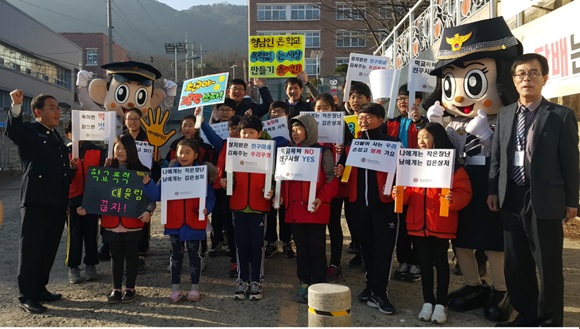 형남초등학교 교문앞에서 형남중학교와 합동으로 실시한 이번 캠페인에는 안전하고 행복한 학교를 위해 다같이 학교 폭력 없애기 활동을 전개했다.