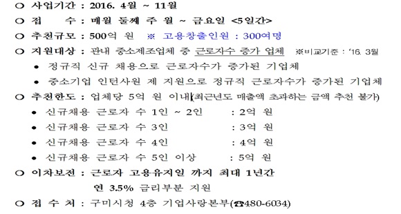 지원대상은 관내 중소제조업체 중 ‘16년 3월을 기준으로 정규직원을 채용해서 직원 수가 증가한 기업체이며 증가한 직원 수에 따라 2억 원에서 최대 5억 원까지 융자 추천하고 고용인원 유지일 까지 최대 1년간 연 3.5%의 이자차액을 지원한다.