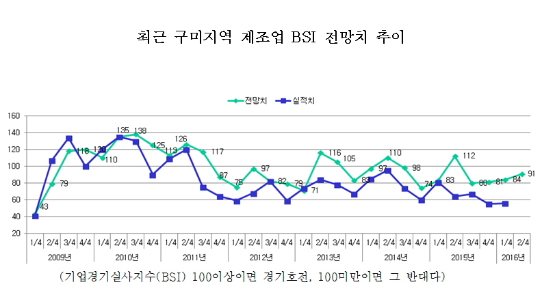 [구미IT뉴스] 구미상공회의소(회장류한규)는 지난 2월 29일 ~ 3월 11일까지 지역 내 81개 제조업체를 대상으로 실시한 ‘2016년 2/4분기 기업경기전망 조사’에 따르면 BSI 전망치는 91로 나타나 여전히 고전할 것으로 예상되었지만 업종별로 명암이 다소 엇갈리게 나타났다.