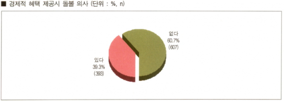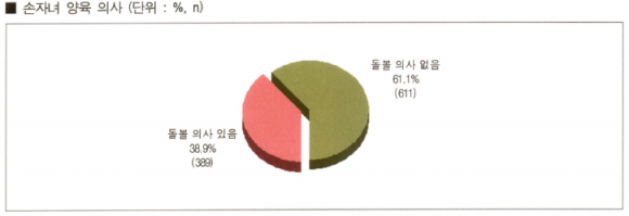 주요 문항으로 ① 손자녀 양육의사에 대해 응답자의 61.1%가 ‘손자녀를 돌 볼 의사가 없다’고 답했다. ② 경제적 혜택 제공시 양육의사에 대해서도 응답자의 60.7%가 ‘손자녀 돌 볼 의사 없다’고 답했다. 이는 손자녀 양육의사는 경제적 혜택과 무관할 수 있음을 나타내고 있다.