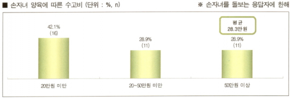 그리고 손자녀를 돌보는 응답자를 대상으로 ‘자녀 우유값, 간식비, 학용품비 등 손자녀 양육에 드는 경비를 제외한 순수 수고비’에 대한 질문에는 평균 28.3만원을 받는 것으로 조사됐다.