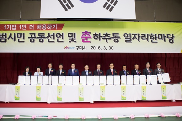 이를 위해 구미시는 3월 30일 박정희체육관에서 2016 춘하추동 취업박람회, 청년 일자리창출 공동선언문 채택, 중소기업 인턴사원제 업무협약식을 갖고, ‘1기업 1인 더 채용하기’운동의 본격적인 시작을 알렸다.