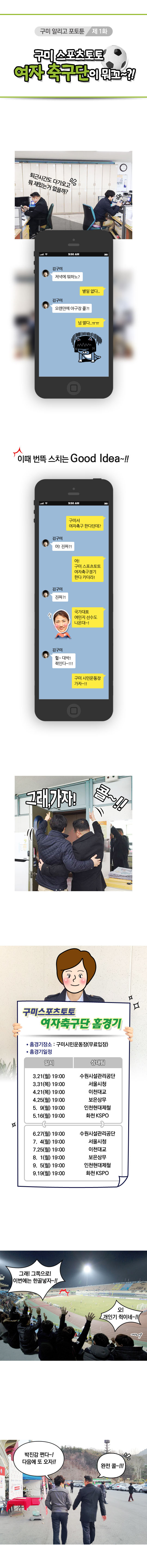 업무 특성상 자칫 형식적이고 획일화되기 쉬운 관공서의 정보제공 방식을 부족하지만 인간적이고 흥미로운 콘텐츠로 바꿔보자는 취지를 가지고 시작한 구미시 포토툰은 제1화 ‘구미 스포츠 토토 여자축구단이 뭐꼬?’로 포문을 열었다. 직원들이 시나리오를 짜고 콘티작성·촬영까지 업무 틈틈이 짬을 내어 준비한 포토툰이 시민들에게 좋은 호응을 얻기를 기대하며, 포토툰은 페이스북, 트위터, 카카오스토리 등 구미시가 운영하는 SNS를 통해 월2회 이상 제공될 예정이다.