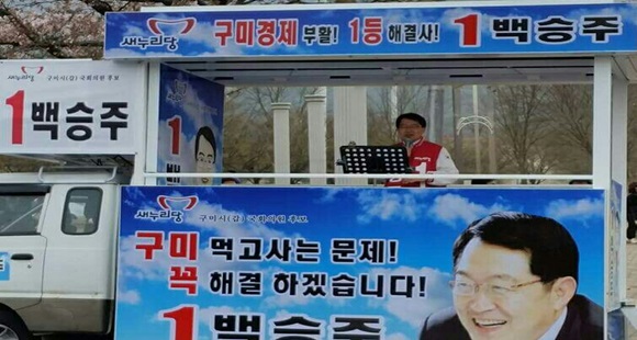 백승주 후보는 이날 금오산 주차장 입구에서 ‘금오산 꽃길 축제’를 찾은 수많은 시민들과 지지자들을 상대로 한 가두유세에서 “구미가 아프면 영남이 아프고, 영남이 힘들면 대한민국이 힘들다. 구미가 일어나야 영남과 대한민국이 일어 설 수 있다.”며, “수출 370여억 달러 신화를 만들었던 구미의 영광을 재현하는데 모든 것을 걸겠다.”고 결연한 의지를 표명했다.