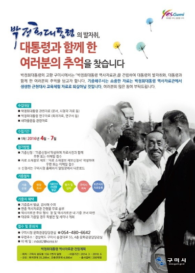 [구미IT뉴스] 구미시는 ‘박정희대통령의 발자취, 대통령과 함께 한 여러분의 추억을 찾습니다.’ 라는 슬로건 아래 7월 31일까지 ‘박정희 대통령 관련 자료 기증 캠페인’을 실시한다.