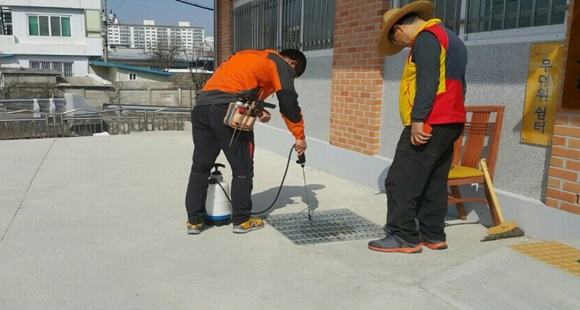 전문 방역업체에서 진행하는 이번 방역작업은 개미, 바퀴벌레, 쥐 등 해충 박멸을 위해 실내 약품 살포작업과 외부에서 해충들이 실내로 들어오지 못하게 외부 살충작업, 외부 화장실은 액체형 소독약 분무로 소독작업을 실시한다.