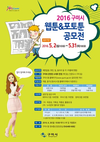 [구미IT뉴스] 구미시는 참신하고 독창적인 웹툰·포토툰 콘텐츠를 발굴하고 지역 정보를 널리 알리기 위해 ‘2016년 구미시 웹툰&포토툰 공모전’을 개최한다.